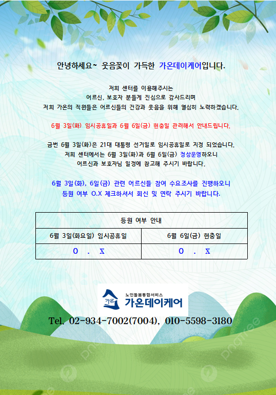 | 제목 | 6월3일(화) 6월6일(금) 정상운영 수요조사 진행합니다.~^^ | 공지일 | 2025.05.17 |