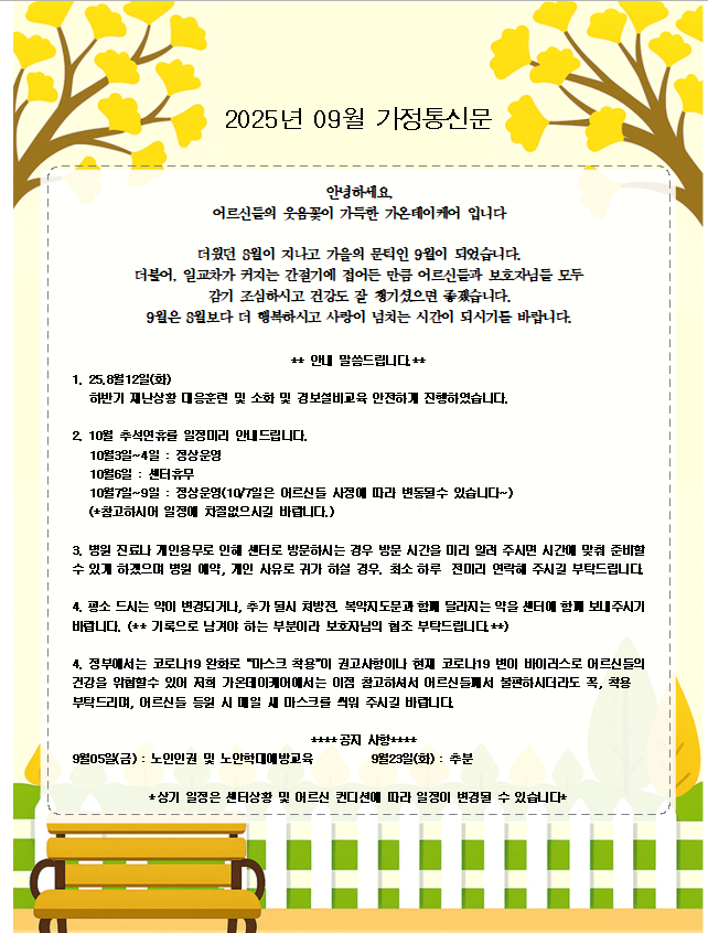 | 제목 | 더웠던 8월이 지나고 가을의 문턱인 9월이 되었습니다.~^^ | 공지일 | 2025.09.03 |