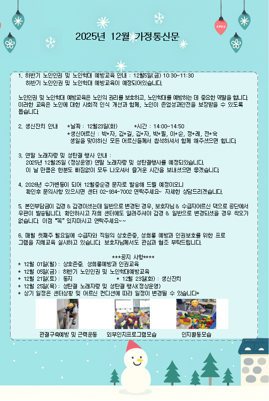 안녕하세요. 어르신들의 웃음꽃이 가득한 가온데이케어입니다^^ 다사다난 했던 한 해가 저물어 가고 있습니다. 아쉬웠던 마음은 떠나 보내고 새로운 날들을 향해 희망이 가득한 12월이 되시길 바랍니다.