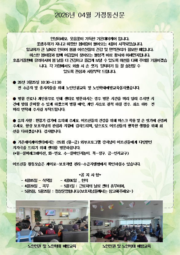 | 제목 | 꽃샘추위가 지나고 따뜻한 봄바람이 불어오는 4월이 시작되었습니다.~^^ | 공지일 | 2026.04.01 |